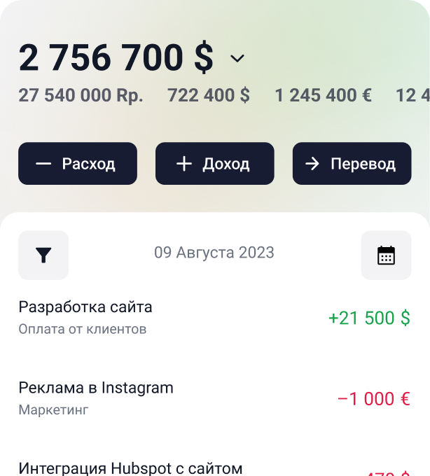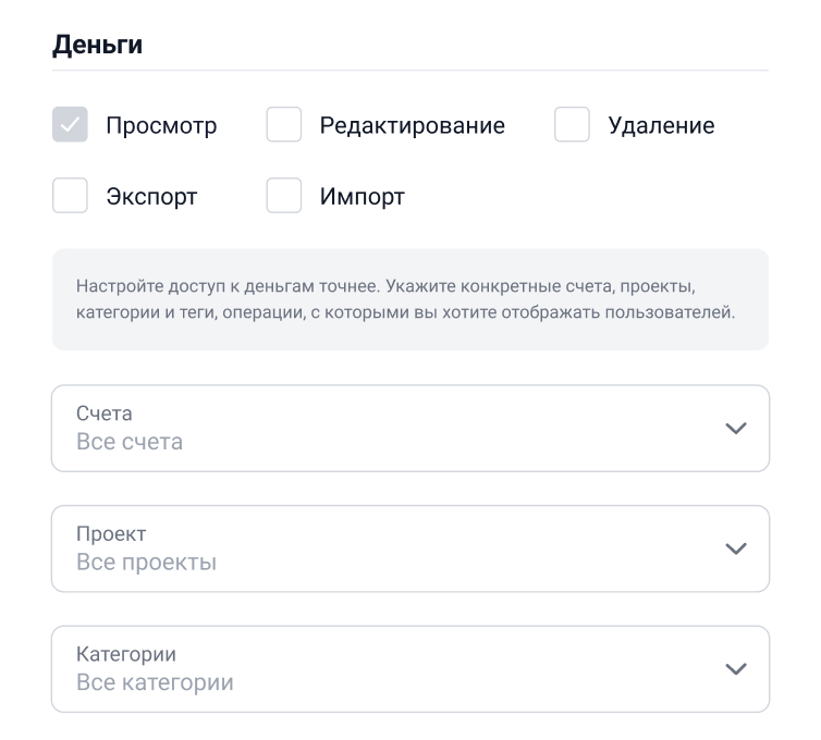 СкороПриглашайте своих сотрудников, предоставляйте им доступ только к конкретным счетам, проектам или статьям.