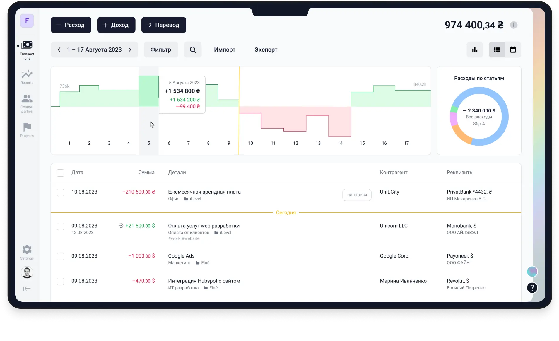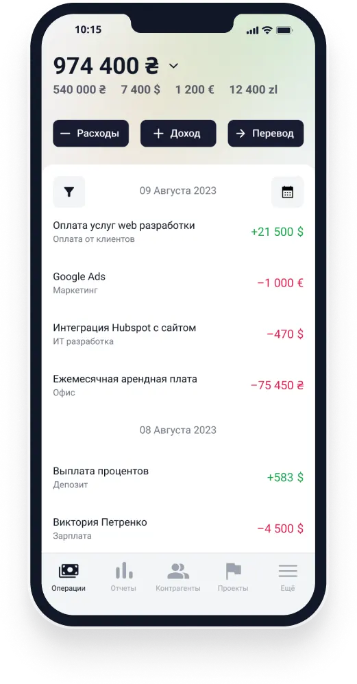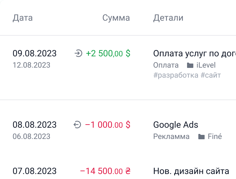 Автоматически загружайте платежи с ПриватБанка и Monobank, через выписку другого банка, или добавляйте их вручную.